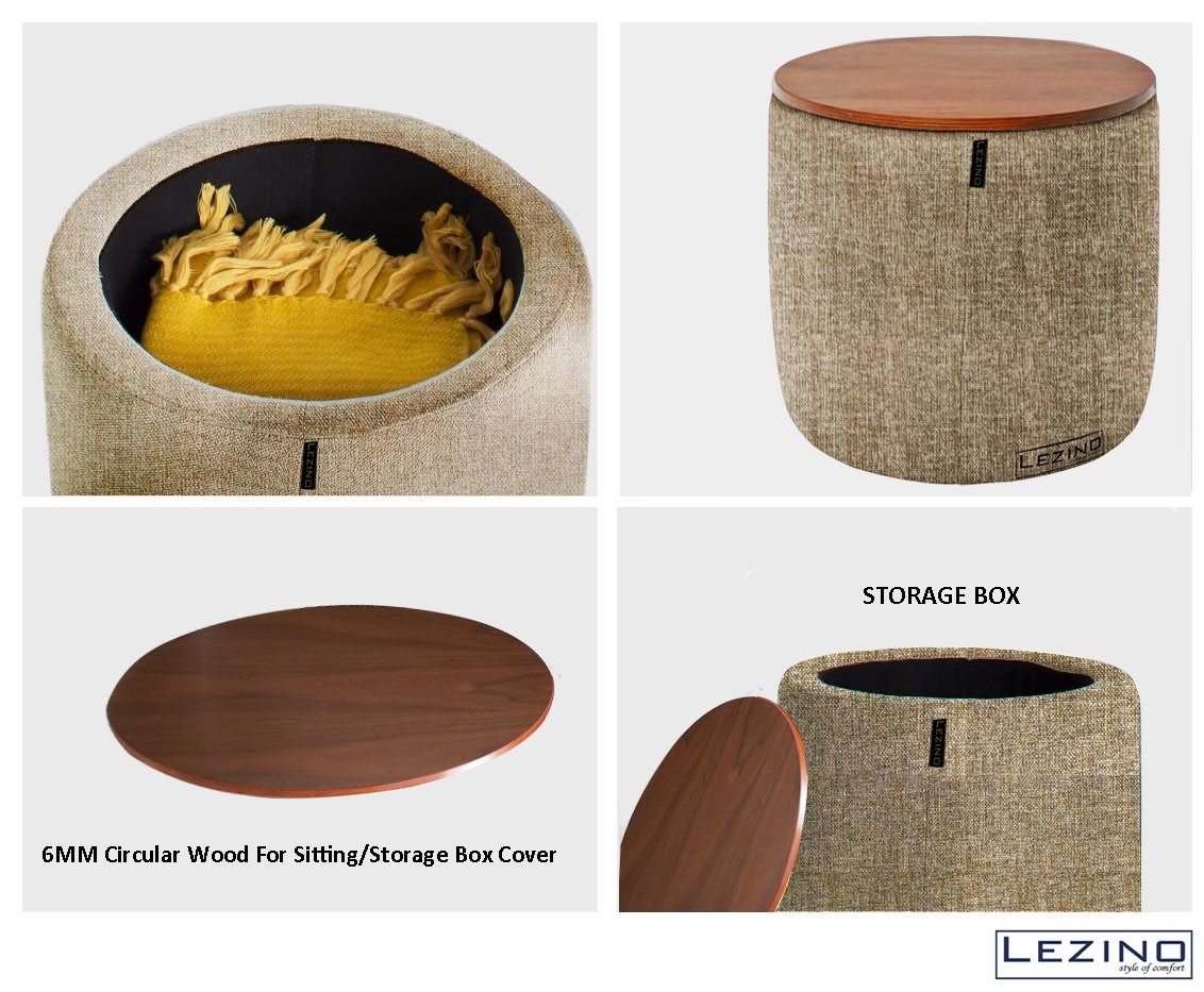 Upholstered in durable Molfino fabric, it is available in two popular, neutral shades: Beige and Grey. The top of the pouffe is capped with a 6MM circular wooden lid, which can be flipped or removed. When the lid is on, it functions as a stable side table or extra sitting surface. When lifted, it reveals the spacious interior storage. Its sturdy construction ensures it is a reliable and stylish addition to your living room, bedroom, or entryway.